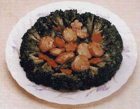 Stir-fry broccoli, add scallops and carrot, mix well. Add
